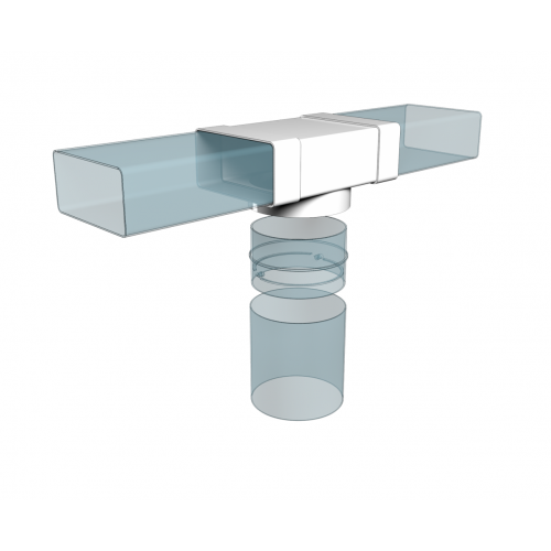 Соединитель-тройник устанавливается между двумя воздуховодами плоского сечения и плотно закрепляется с двух сторон. Прямоугольный воздуховод устанавливается во внутрь соединителя, а круглый воздуховод соединяется при помощи муфты СКП. Фасонные изделия и вентиляторы устанавливаются во внутрь патрубка. Благодаря плотному примыканию система способна существенно сэкономить занимаемое пространство. Для герметизации стыков можно использовать прозрачный герметик и LM PVC лента монтажную из ПВХ