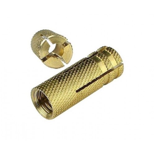 Латунная цанга, в силу мягкости металла изготовления, не имеет расклинивающего элемента и состоит только из гильзы. У стальной и латунной цанги гильза до половины рассечена на 4 части и имеет насечки для предотвращения проворачивания в бетоне.