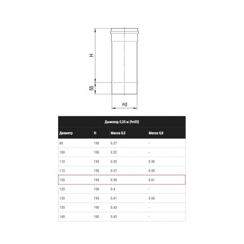Является основным элементом дымоходной системы. Дымоход 0,25м (430/0,8 мм) Ф120 предназначен для отведения продуктов сгорания на прямых участках. Дымоход 0,25м (430/0,8 мм) применяется как вставка между элементами (например, между двумя элементами Колено угол 135° (430/0,8 мм) для увеличения расстояния смещения данных элементов). Данный элемент применяется для "добора" длины одностенного прямолинейного участка дымохода при подключении его к теплогенерирующему прибору (банной печи, отопительной печи, камину, газовой колонки).