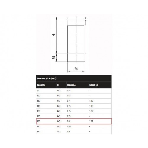 Является основным элементом дымоходной системы. Дымоход 0,5м (430/0,8 мм) Ф130 предназначен для отведения продуктов сгорания на прямых участках. Дымоход 0,5м (430/0,8 мм) применяется как вставка между элементами (например, между двумя элементами Колено угол 135° (430/0,8 мм) для увеличения расстояния смещения данных элементов). Данный элемент применяется для "добора" длины одностенного прямолинейного участка дымохода при подключении его к теплогенерирующему прибору (банной печи, отопительной печи, камину, газовой колонки).