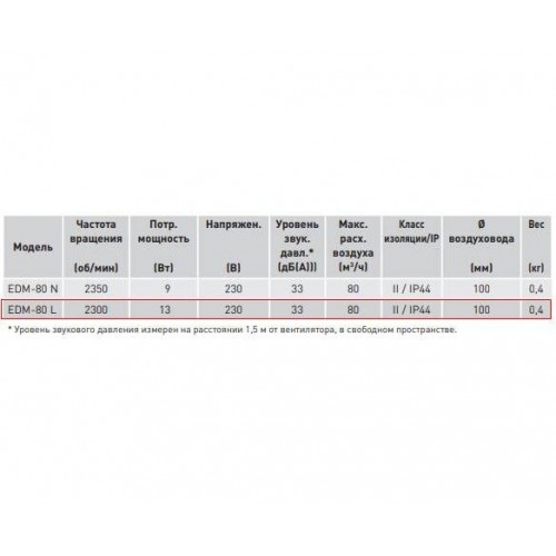 Вентиляторы EDM-80 изготавливаются из высококачественного пластика, комплектуются световым индикатором работы и однофазным электродвигателем (230В-50Гц), класс изоляции В, со встроенной термозащитой. Максимальный расход воздуха составляет 80 м3/ч. Вентиляторы предназначены для присоединения к воздуховодам диаметром 100 мм. Вентиляторы имеют II класс электробезопасности, класс защиты IP 44 и рабочую температуру воздуха от 0°С до +40°С. Модели разных размеров отличаются конструктивными и функциональными особенностями, которые обозначаются определенными буквами.