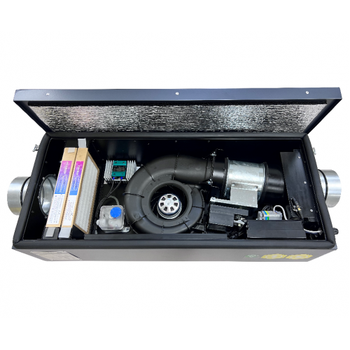 Вентилятор с ЕС-мотором (Германия). Очень тихий в классе, благодаря бесщеточной конструкции. Имеет 7-10 скоростей вентилятора. Встроенная автоматика изолирована от внешней среды, имеет полный комплект необходимых датчиков. Автоматика на выбор.