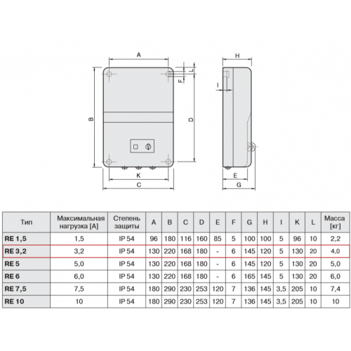 Когда рукоятка регулятора находится в положении 0, ток на выходные клеммы не подается. Лампа индикатора на передней панели показывает, что регулятор работает. При срабатывании предохранителя, его перезапуск осуществляется вручную, кнопкой на корпусе. Корпус RE изготовлен из негорючего термопластика. Подаваемое напряжение 230 В 50/60 Гц.