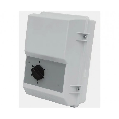 Однофазный регулятор, который управляет скоростью вентилятора, изменяя подаваемое напряжение (пять ступеней). Допускается управление несколькими двигателями, если общий потребляемый ток не превышает номинального тока регулятора. Скорость переключается вручную рукояткой на корпусе. Регулятор имеет выходной сигнал 230 В для приведения в действие приводов заслонок, электронагревателя или другого оборудования.