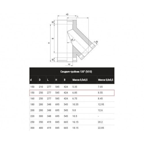 Двухконтурная, или сэндвич структура этого соединительного элемента аналогична конструктиву сэндвич труб дымоходного канала. Имеющийся теплоизоляционный слой из минерального материала минимизирует образование конденсата. Угол стыковки 135˚ и внутренняя гладкая поверхность, контактирующая с продуктами горения, делает сэндвич тройник элементом, не препятствующим прохождению дыма и сохраняющим оптимальный уровень тяги.
