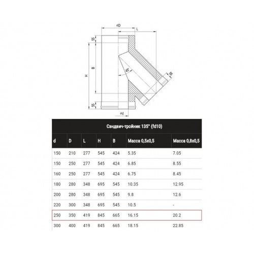 Сэндвич-тройник 135° Ф 250/350 мм из нержавейки для дымохода двухконтурный предназначен для стыковки двух сэндвич труб из нержавейки одинакового диаметра под углом в 135˚. Соединительный узел, образованный сэндвич тройником, важен как для разветвления дымоотводного канала, так и для плановых работ по обслуживанию дымохода. Сэндвич-тройник 135° обеспечивает более плавный поворот печных газов, чем Сэндвич-тройник 90°, тем самым обеспечивая наилучшую тягу в дымоходе и препятствуя осаждению сажи в местах изгиба.