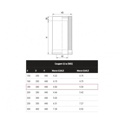 Дымоход сэндвич – Является основным элементом дымоходной системы. Сэндвич предназначен для отведения продуктов сгорания на прямых участках. . Сэндвич труба 180/280мм нерж/нерж длинной 0,5 метров, представляет собой две трубы, где внутренний диаметр 180мм. Изготовленные из нержавеющей стали толщиной 0,8мм, 430 марки стали. Наружная труба, сэндвич дымохода, диаметром 280 мм, также сделанная из 430 марки нержавейки, толщиной 0.5мм. Пространство между трубами заполняется негорючим базальтовым теплоизоляционным материалом.
