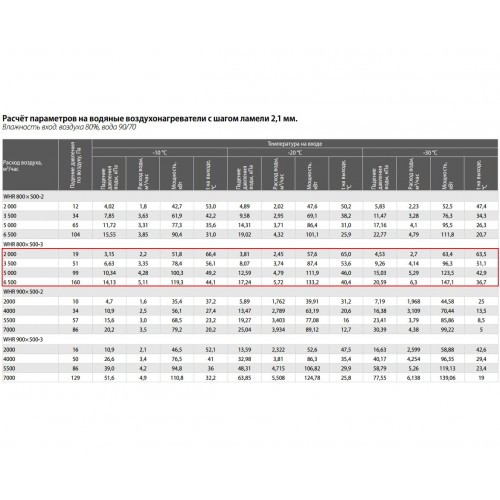 В водяном нагревателе используемый шаг оребрения составляет 2,1 мм., вместо общепринятого (для наборных систем вентиляции) 2,5 мм., что позволило существенно увеличить теплоотдачу, при этом не существенно увеличивается сопротивление теплообменника и оптимизируются массогабаритные показатели.