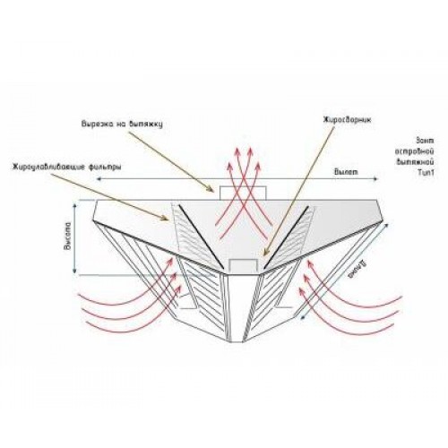 Треугольные островные вытяжные зонты размещаются непосредственно над оборудованием, расположенном в отдалении от стены, и крепятся к потолку.