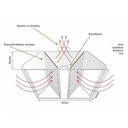 Трапециальные островные вытяжные зонты размещаются непосредственно над оборудованием, удаленным от стены, и крепятся к потолку.